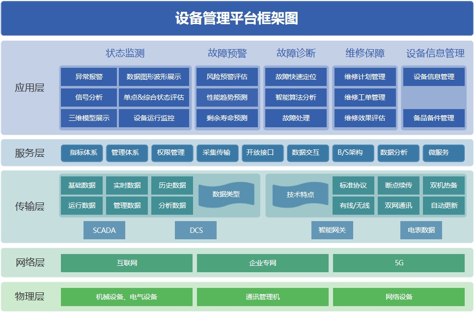 设备健康管理平台是基于状态监测的智能化维保系统,通过对系统部件进行定期(或连续)的状态监测,判定设备所处的状态,预测设备状态未来的发展趋势,依据设备的状态发展趋势和可能的故障模式,预先制定预测性维护计划。智能设备中的零部件高度集成,通过预测性维护,对系统的各个部件进行实时检测,以所检测到的状态参数为基础,对设备未来的工作状况进行预测,进而实现智能装备的预测性维护。